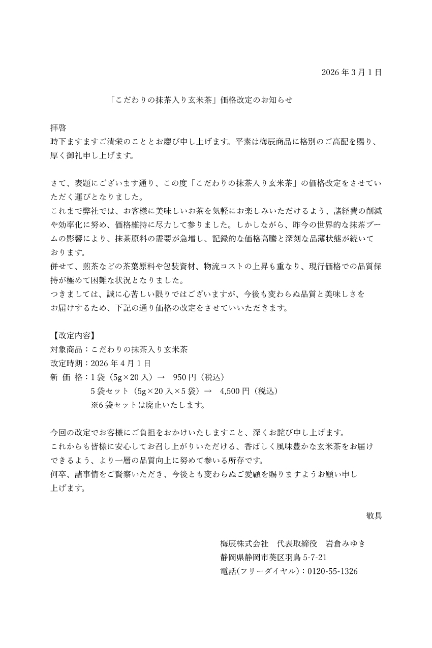 2026年4月1日より、「こだわりの抹茶入り玄米茶」を上記の内容で価格改訂させていただきます。