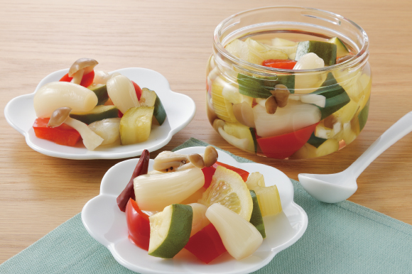 ③保存用ガラス容器にはちみつらっきょうと野菜を入れ、①のマリネ液を注ぎ、冷蔵庫で冷やせば完成!!